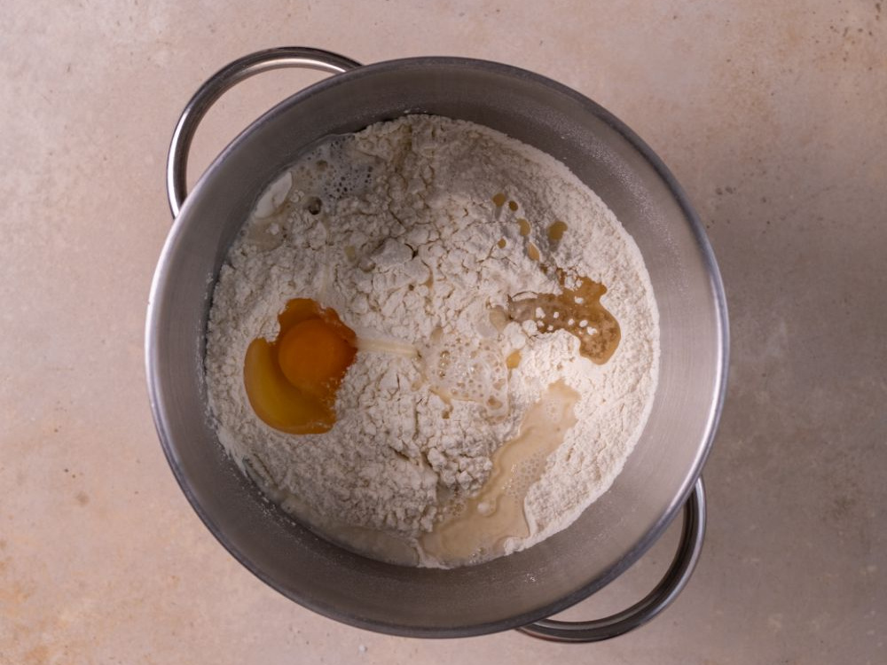 Вливаем тёплую воду (200 мл), растительное масло (60 мл) и добавляем яйцо (1 шт).