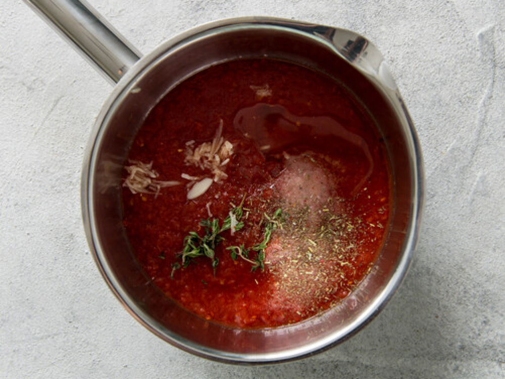 Для соуса в сотейнике соединяем все ингредиенты и ставим на огонь. Доводим до кипения, убавляем огонь и увариваем 5-10 минут до тех пор, пока влага не испарится и соус не станет гуще.