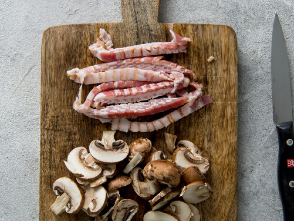 Грибы нарезаем тонкими пластинами, бекон на небольшие кусочки.