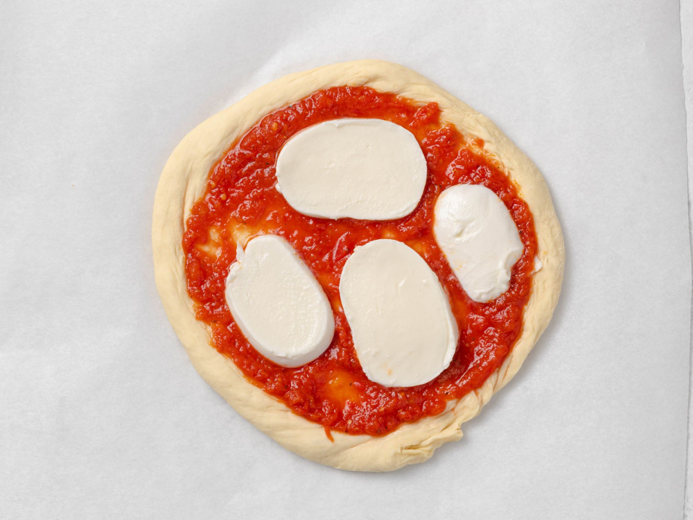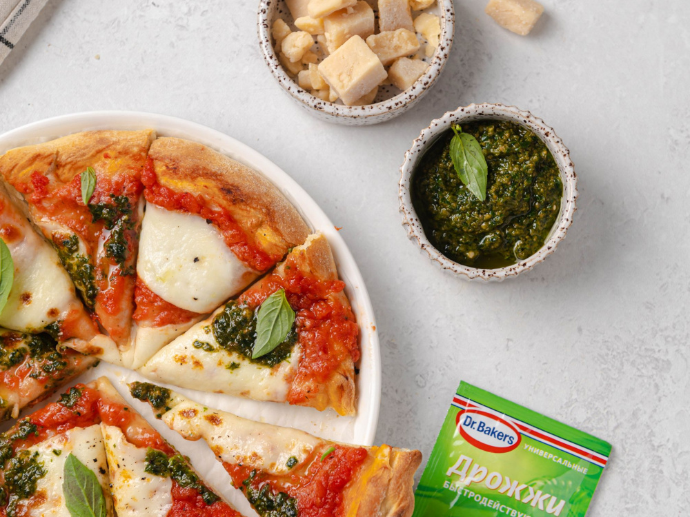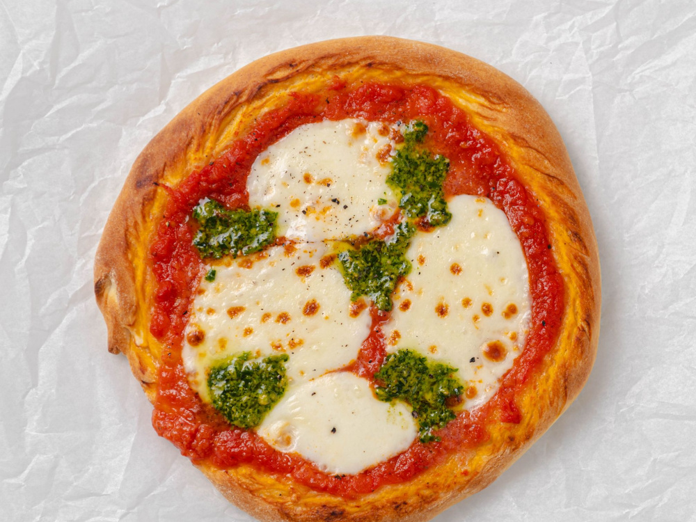 Выпекаем в заранее разогретой до 270°С духовке на режиме конвекции 5–7 минут на верхнем ярусе. Вынимаем, выкладываем сверху соус песто.