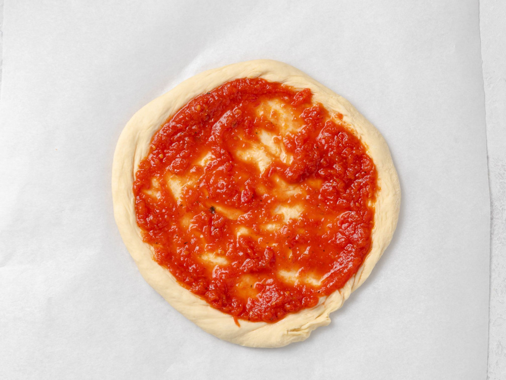 Подошедшее тесто делим на две части. Формируем из каждой круг. Промазываем соусом.