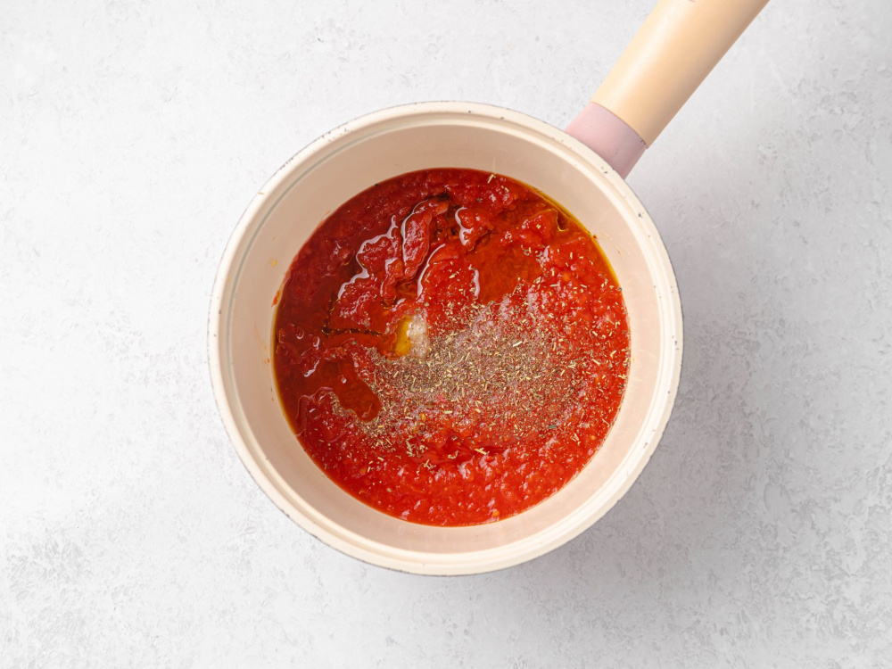 Для соуса в сотейник выливаем тёртые томаты (200 г), оливковое масло (1–2 ст. л.), добавляем щепотку соли, чеснок (1 зубчик), итальянские травы. Ставим на огонь и увариваем до густого состояния.