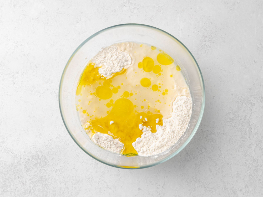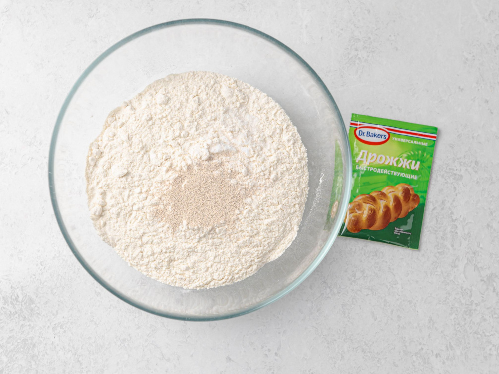 В миске смешиваем муку (250 г), соль (2 г) и дрожжи (1/2 упаковки).