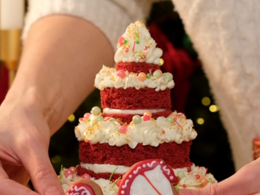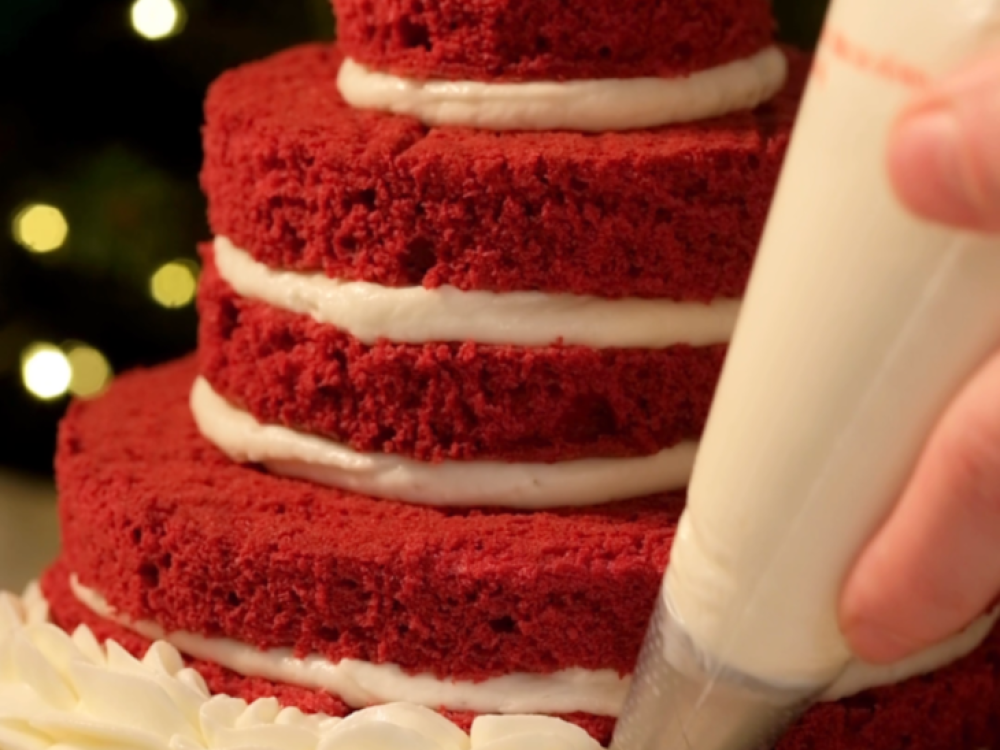 Собираем торт. На первый корж наносим слой крема с помощью кондитерского мешка. Накрываем вторым коржом, снова промазываем кремом и накрываем третьим и так далее, чтобы получилась ёлочка. На выступы коржей и на макушку отсаживаем крем с помощью кондитерского мешка с насадкой «французская звезда».