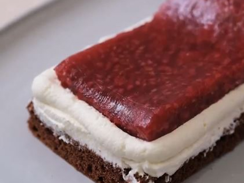 Приступаем к сборке: выкладываем бисквит (22×8 см) на блюдо, пропитываем холодным кофе. Наносим ровный слой крема. Делаем бортик из крема с помощью кондитерского мешка, в центр помещаем слой компоте (вырезаем его размером приблизительно 20×6 см). Сверху следующий бисквит (пропитываем, покрываем кремом и слой компоте). Далее третий бисквит (пропитка), слой крема.