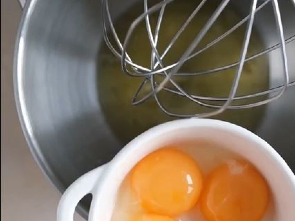 Для бисквита аккуратно отделяем белки от желтков. Яйца должны быть комнатной температуры. К белкам добавляем соль и начинаем взбивать на медленной скорости ручным миксером или в кухонной машине с насадкой венчик. Через минуту увеличиваем скорость до высокой и взбиваем до мягких пиков. В три-четыре захода добавляем сахар и взбиваем до устойчивых пиков, как для меренги.