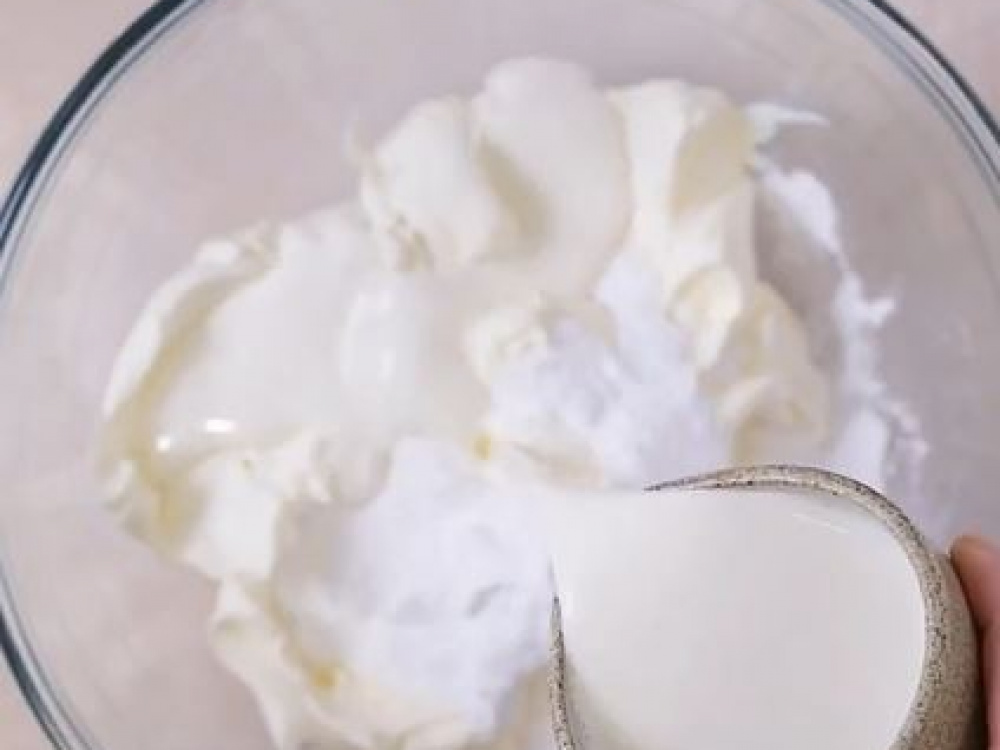 Для крема в большой миске объединяем маскарпоне, холодные сливки, сахарную пудру и ванилин. Взбиваем с помощью миксера до воздушного состояния.