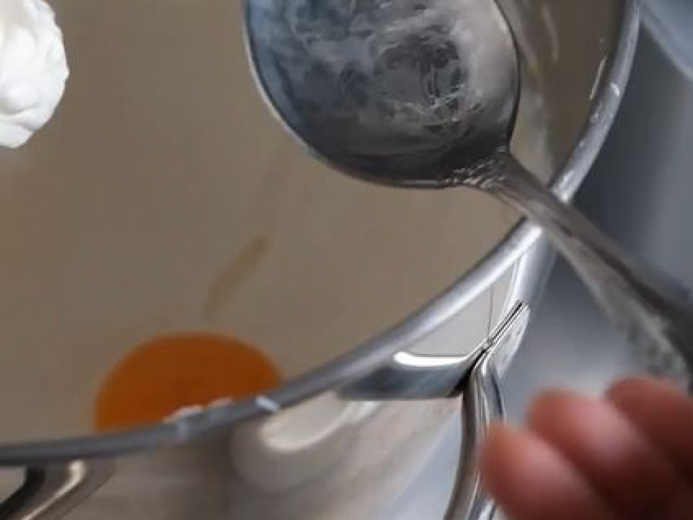 Отправляем в белковую массу ванильный сахар и вводим по одному желтку, каждый раз качественно перемешивая миксером на высокой скорости. Затем вливаем растительное масло и еще раз перемешиваем.