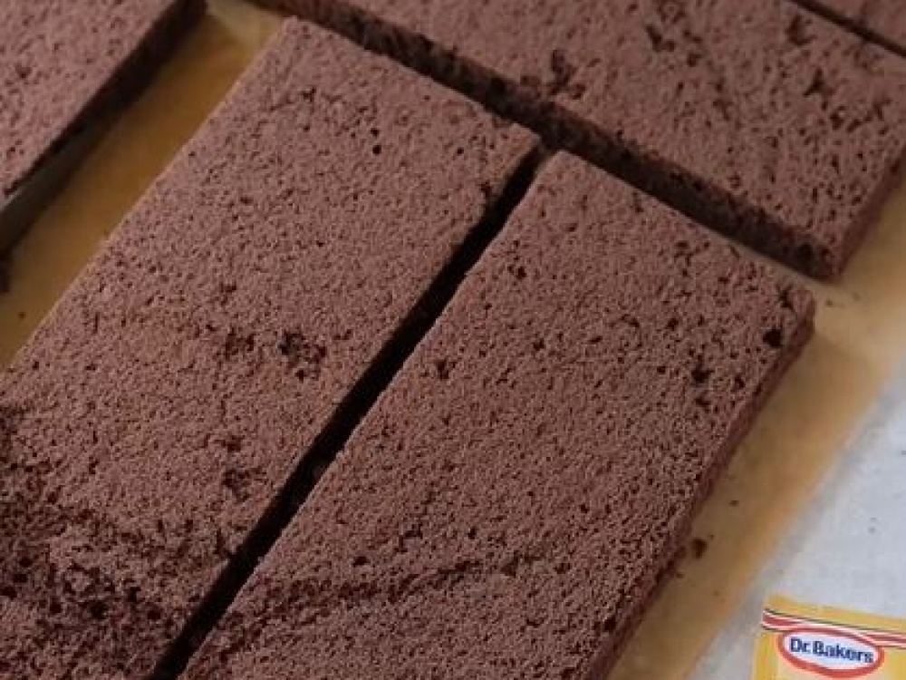 Даём бисквиту немного остыть. Обрезаем края. Разрезаем бисквит на 5 частей длиной 22 см, шириной 3 части - 8 см, одна - 6 см и одна 3 см.