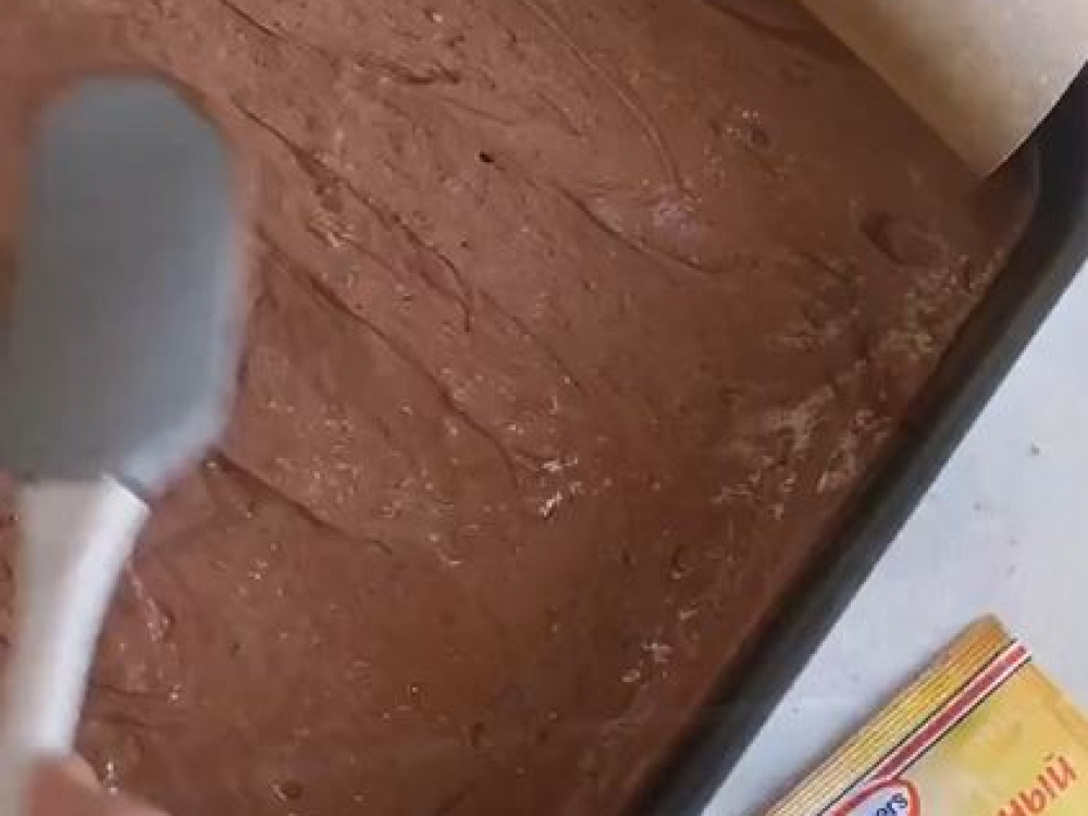 Противень размером приблизительно 26×32 см застилаем пергаментом. Выливаем тесто и равномерно распределяем по всей поверхности.