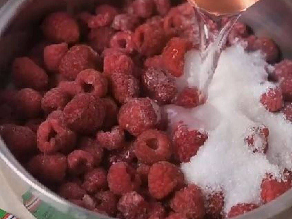 Приготовим компоте. Малину пересыпаем в сотейник, вливаем воду и добавляем сахар.