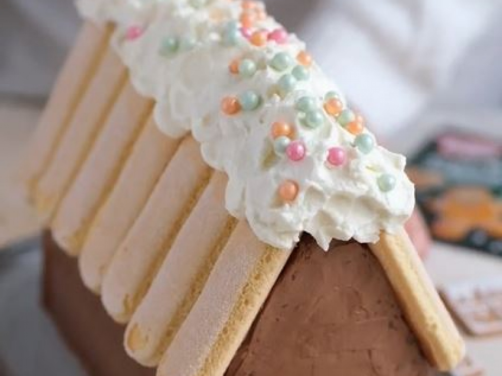 Оставшимся кремом делаем шапочку на крыше, имитирующую снег. Украшаем посыпкой.