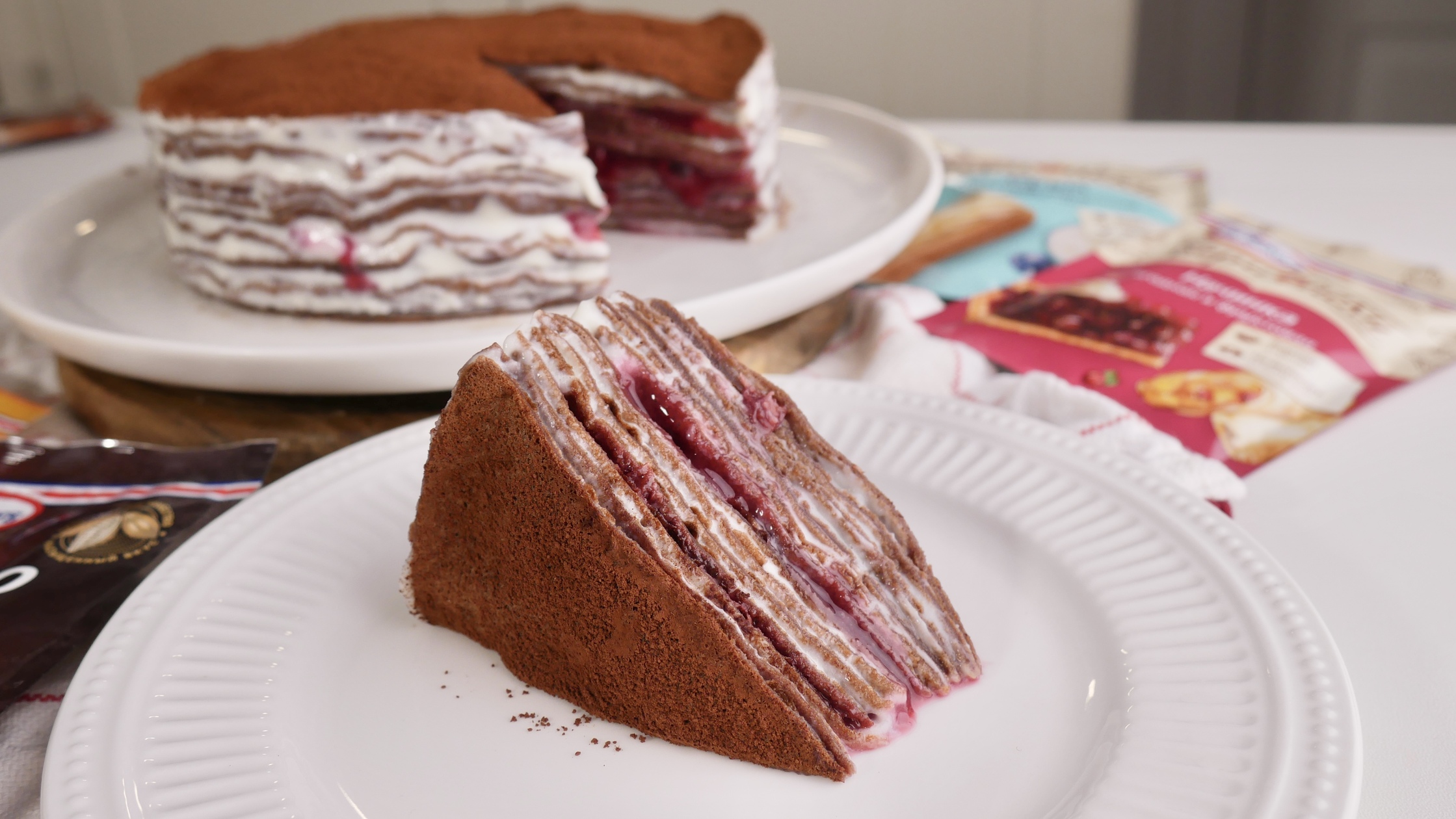 Когда крем и начинка остынут, начинаем собирать торт, используя кондитерское кольцо и промазывая каждый блинчик кремом. В середине изделия добавляем ягодные слои. Оставляем торт для стабилизации в холоде минимум на 5 часов.