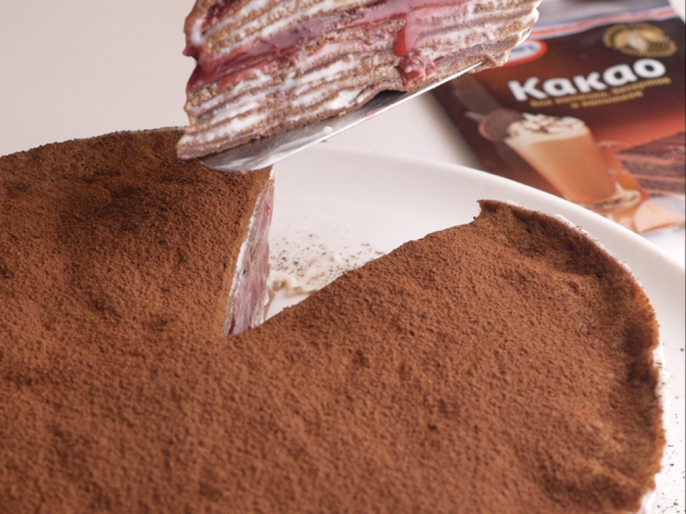 При подаче вынимаем из кольца и посыпаем какао-порошком Dr. Bakers (10 г). Приятного аппетита!