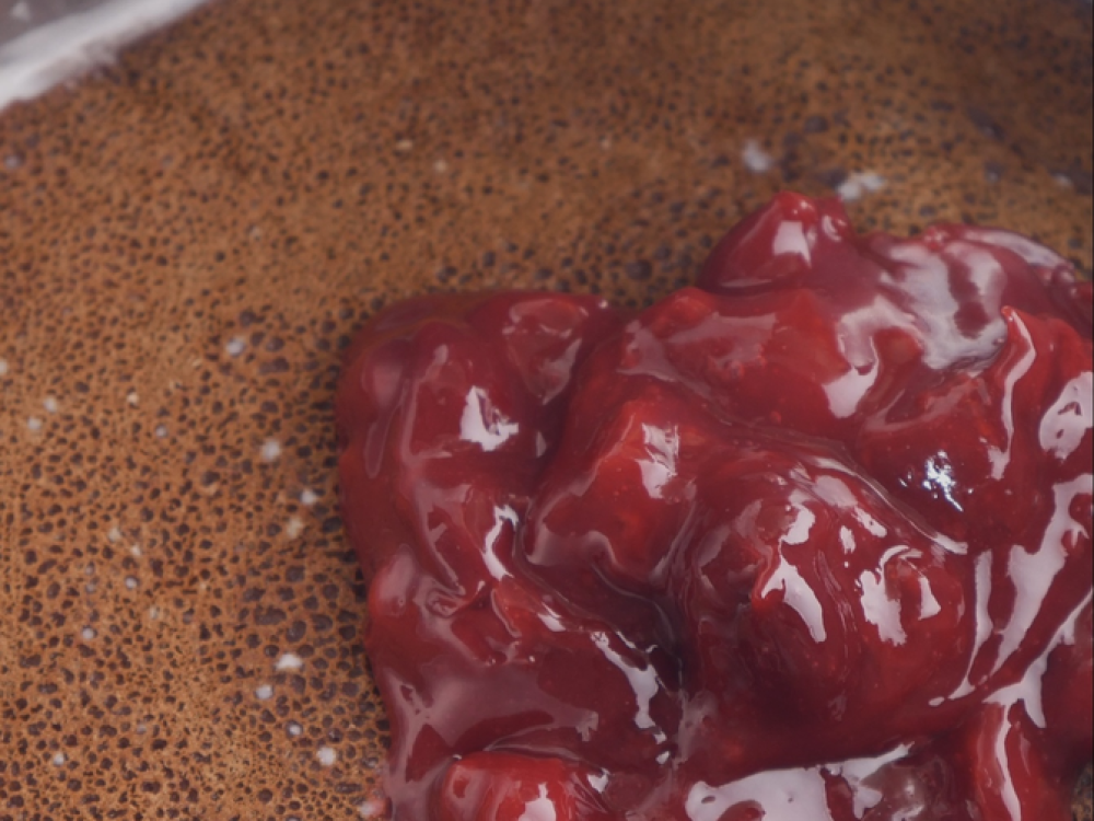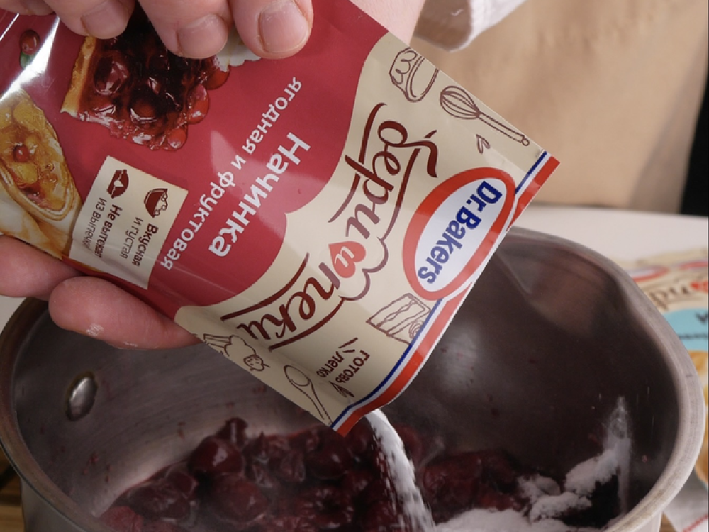 Готовим начинку. Вишню (300 г) соединяем с сахаром (80 г) и ставим на огонь. Когда ягода даст сок, постепенно добавляем смесь для начинки, хорошо перемешивая. Через 1-2 минуты, когда начинка загустеет, снимаем с огня.