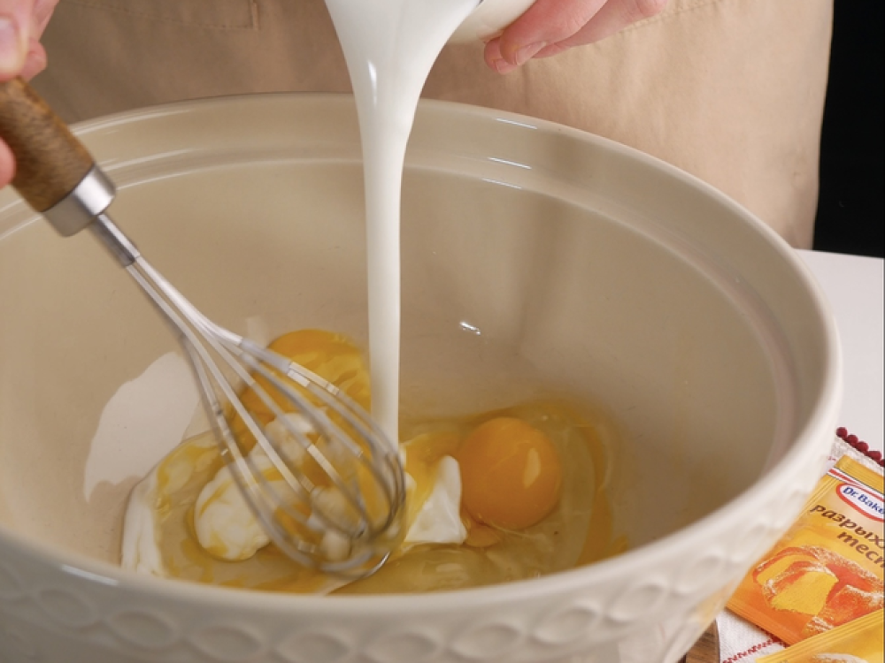 Смешиваем яйцо (3 шт.) с кефиром (500 г) и молоком (300 г). Добавляем сахар (40 г), ванильный сахар Dr. Bakers (1 уп.) и растительное масло (4 ст. л.).