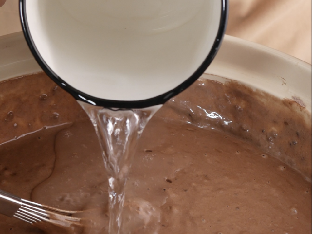 Соединяем жидкие и сухие ингредиенты. Вливаем воду 100°C и хорошо смешиваем всё венчиком.