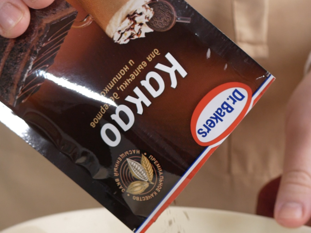 Готовим тесто. Смешиваем муку (350 г) с разрыхлителем Dr. Bakers (1 ч. л.) и какао-порошком (40 г).