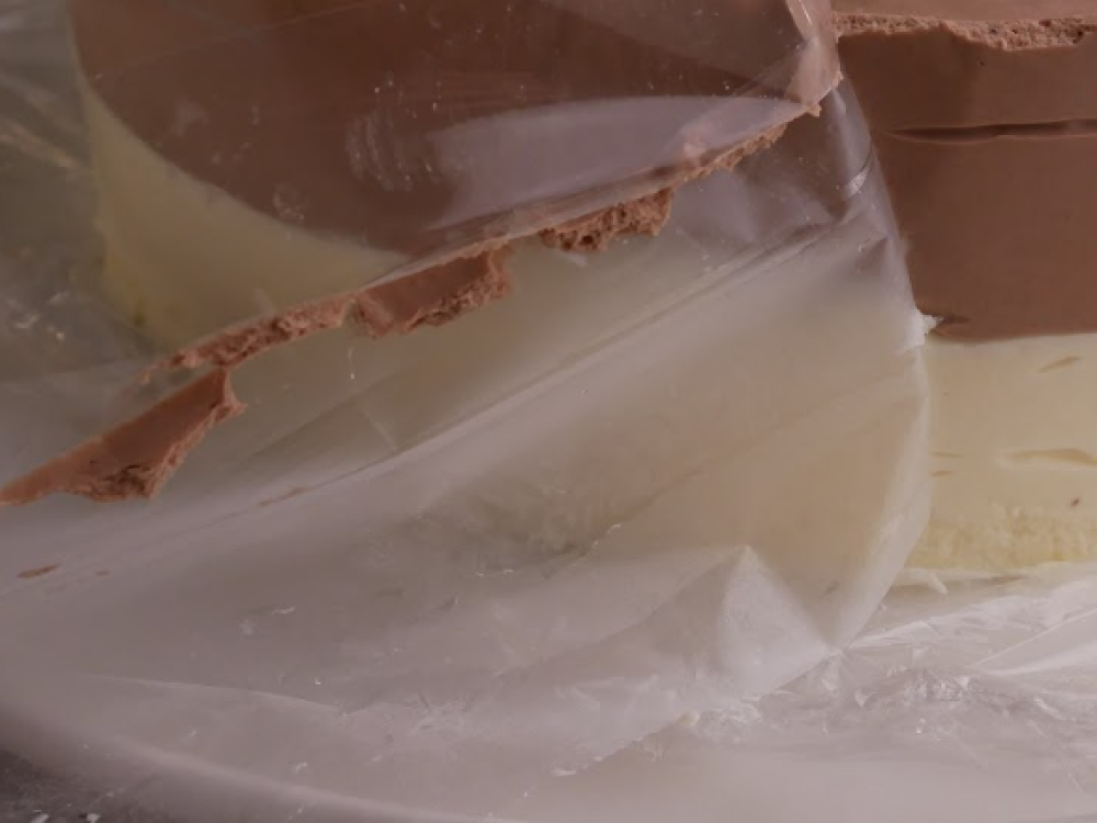 Замороженный торт достаем из морозильной камеры. Чтобы достать торт из формы, можно несколько минут прогреть стенки формы руками или обернуть горячим, влажным полотенцем. Переворачиваем торт так, чтобы бисквит оказался внизу. Перекладываем на решетку.