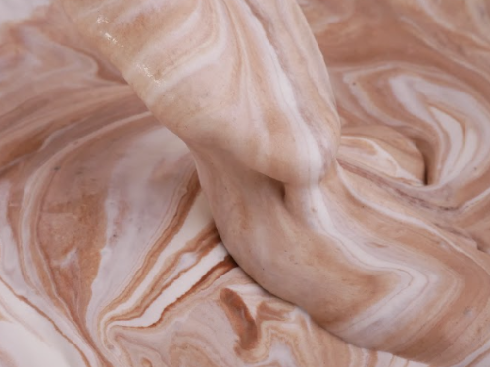 Разбиваем в глубокую посуду охлажденные куриные яйца и взбиваем их с сахарным песком на высокой скорости до пышности и увеличения объема. Просеиваем пшеничную муку, добавляем к ней разрыхлитель, миндальную муку и какао. Хорошо перемешиваем смесь, еще лучше сложить ее в чистый целлофановый пакет и немного потрясти. Аккуратно вмешиваем готовую сухую смесь в растопленный со сливками шоколад. На выходе получаем жидкое тесто, похожее на блинное.