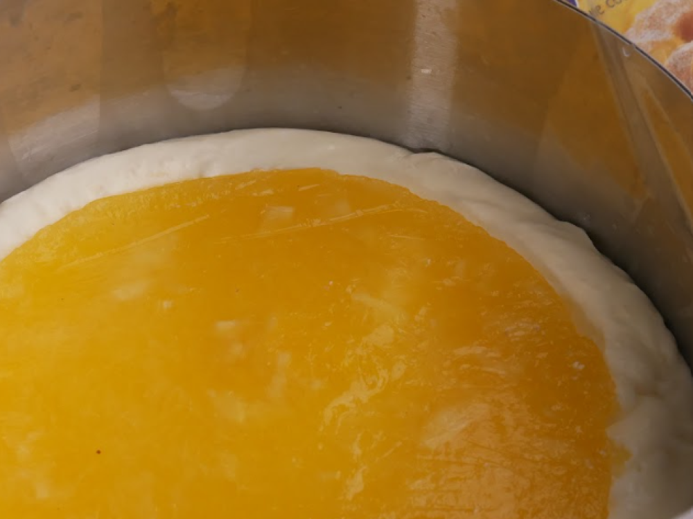Подготавливаем кулинарное кольцо или разъемную форму. Диаметр формы для компоте должен быть меньше диаметра будущего торта. Снаружи оборачиваем форму пищевой пленкой. Переливаем готовое компоте и ставим в морозильную камеру. Жирные сливки, миску, в которой будем их взбивать, и венчики миксера кладем на 10 минут в морозилку. Чтобы сливки хорошо взбивались и не расслоились, приступать к взбиванию нужно сразу, как только достали с холода. Взбиваем сливки миксером на высоких оборотах до устойчивых пиков. Убираем в холодильник. В кастрюлю с толстым дном выливаем апельсиновый сок, яйца, смешиваем. Добавляем мелкий сахарный песок, кукурузный крахмал и цедру апельсина. Ставим на средний огонь. Помешивая, варим до загустения. Остужаем получившуюся смесь до 60 градусов и вводим желатин. Продолжаем перемешивать венчиком до полного растворения желатина. Когда смесь остынет до комнатной температуры, вводим взбитые сливки. Внимательно отнеситесь к этому пункту, если не дать смеси остыть и сразу вылить в сливки, они могут опасть или свернуться. Подготовим форму для муссового торта. Обернем пищевой пленкой внутри и снаружи кольцо диаметром 20 см. Это нужно для того, чтобы в дальнейшем было легче достать готовый торт. 12. Силиконовой лопаткой аккуратно перекладываем апельсиновый мусс в кольцо, сверху посередине кладем замороженное компоте, слегка утапливая его в муссе. Ставим в морозильную камеру.