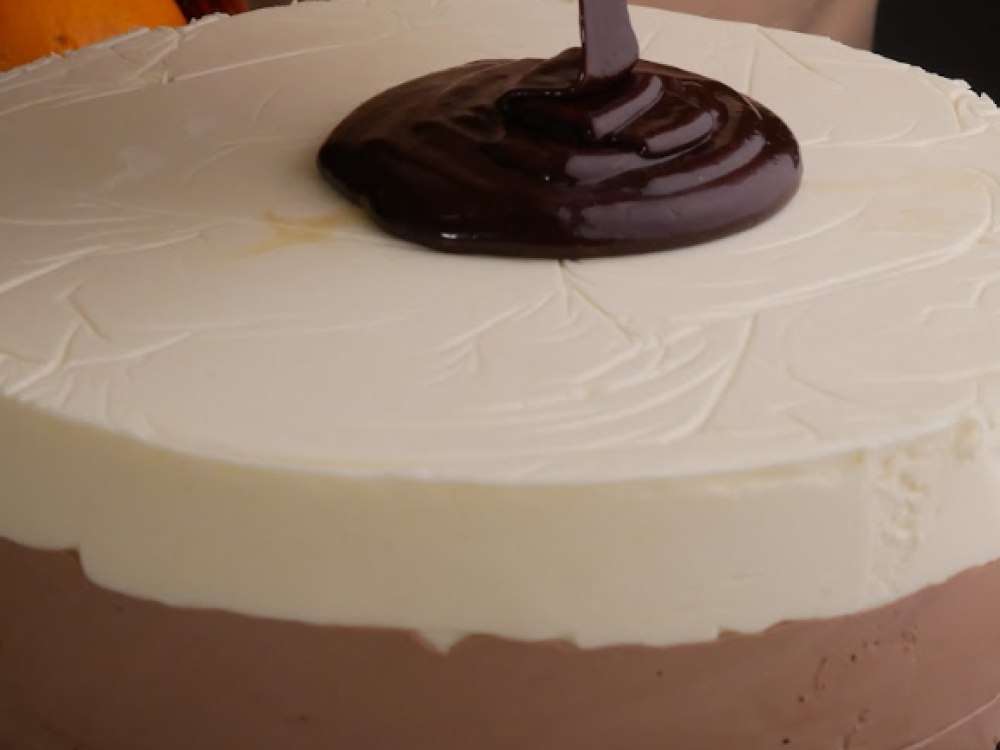 Остывшей глазурью покрываем торт со всех сторон. Стараемся лить глазурь равномерно, слегка поворачивая торт в стороны. Перекладываем украшенный торт на блюдо и ставим в холодильник на пару часов для размораживания и объединения вкусов. Непосредственно перед подачей можно декорировать муссовый торт завитками белого шоколада или апельсиновыми цукатами. Чтобы аккуратно нарезать торт перед подачей, опустите острый нож на несколько секунд в кипяток. Переносить кусочки можно кулинарным шпателем или плоской лопаткой. Приятного аппетита!
