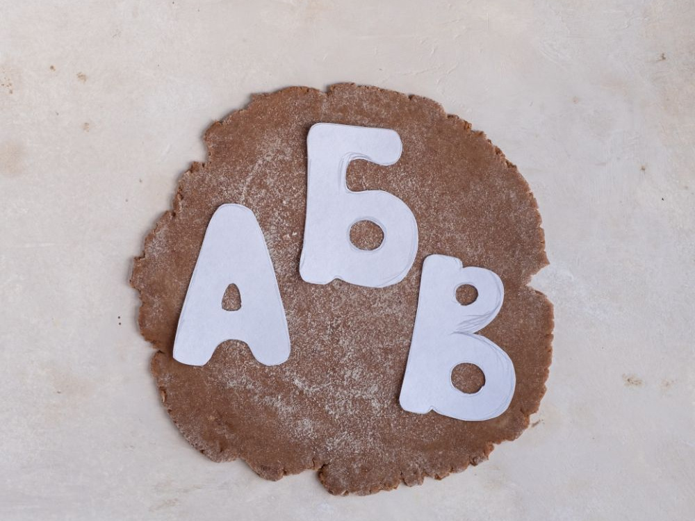Для пряничных букв готовим любое тесто для пряников или песочного печенья. Мы приготовили пряники на основе смеси для пряников «Бери и пеки». Раскатываем его в пласт толщиной 4-5 мм. Вырезаем буквы с помощью вырубки для печенья или по трафарету.