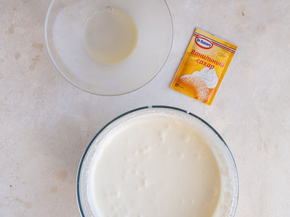 Продолжая взбивать, всыпаем ванильный сахар (1 уп.) и вливаем тонкой струйкой сгущённое молоко.