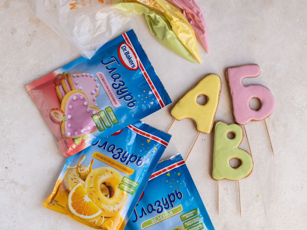 На полностью остывшие буквы наносим сахарную глазурь (1 уп.), приготовленную согласно инструкции на упаковке, и даём полностью застыть.