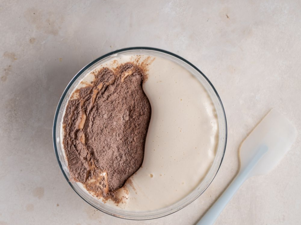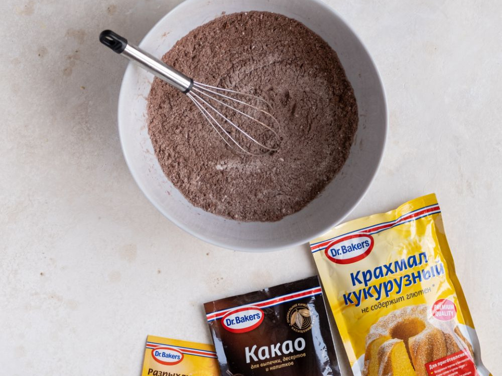 Для приготовления бисквита смешиваем муку (90 г), какао (25 г), крахмал (15 г) и разрыхлитель (1,5 ч. л.).