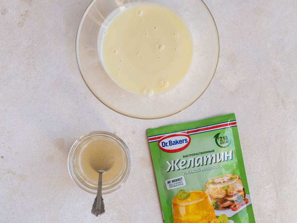 Для крема разводим в воде (50 мл) желатин (10 г) и нагреваем согласно инструкции на упаковке до полного растворения. Вливаем желатин в сгущённое молоко (210 г) комнатной температуры и тщательно размешиваем.