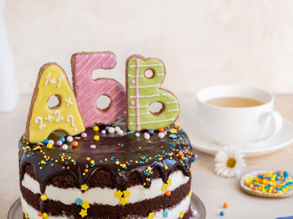 Декорируем торт буквами и посыпкой. Подаём к столу.