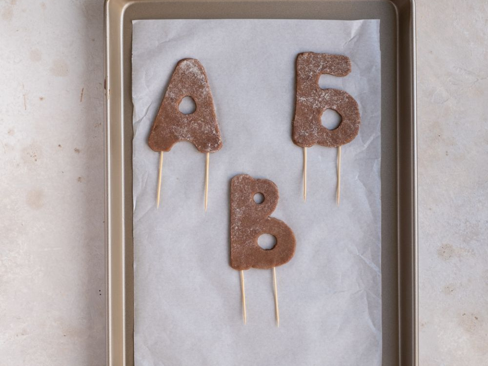 Перекладываем буквы на противень для выпечки, вставляем зубочистки и выпекаем до готовности.