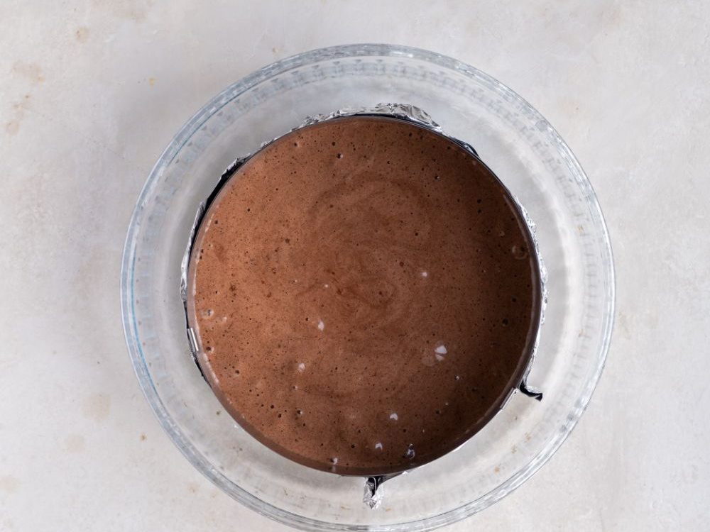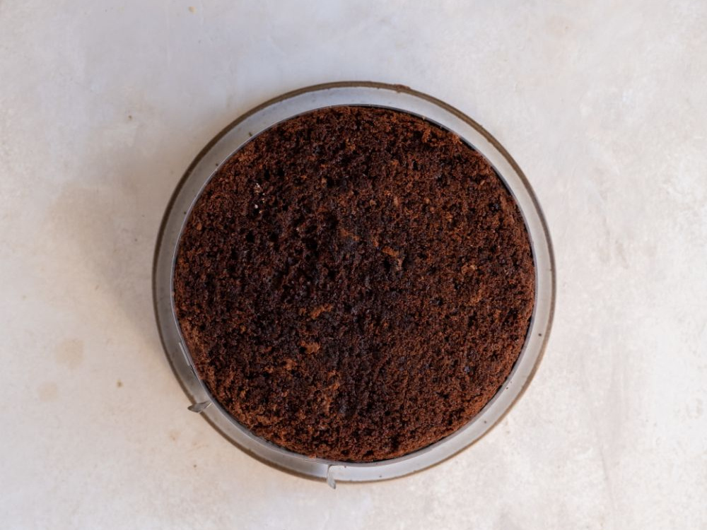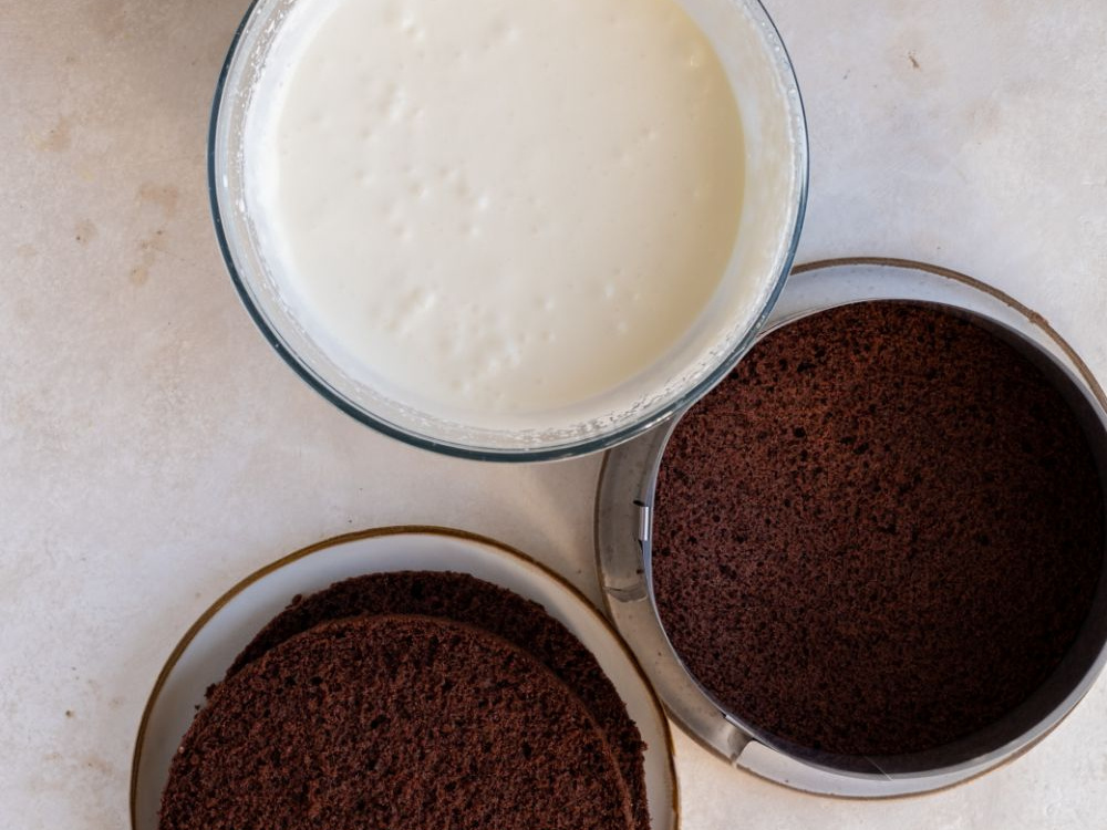 Переливаем тесто в заранее подготовленную форму диаметром 18-20 см. Выпекаем в разогретой духовке при температуре 170°С в течение 45-60 минут (духовку в первые 40 минут открывать не рекомендуется). Проверяем готовность деревянной шпажкой. Даём бисквиту слегка остыть, достаём его из формы, оборачиваем плёнкой и убираем в холодильник на 6-8 часов. Перед приготовлением крема разрезаем бисквит на три равные части.