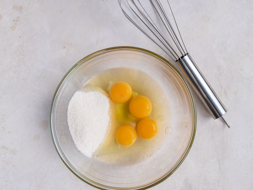 Яйца (4 шт.) взбиваем с сахаром (120 г) в пышную светлую массу.