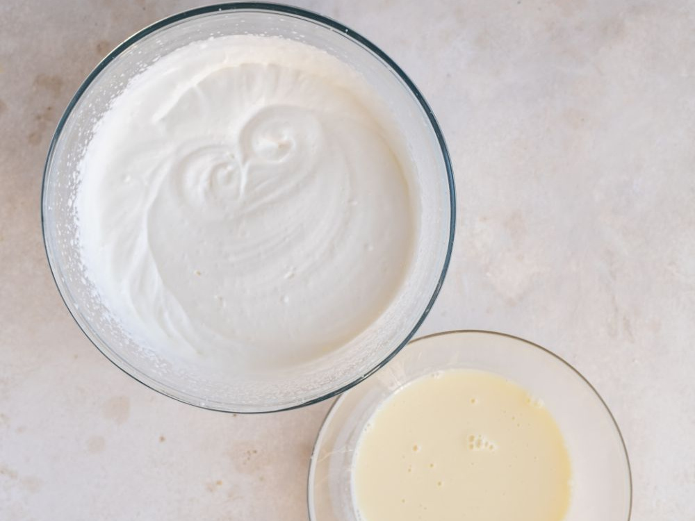 Холодные сливки (350 мл) взбиваем до мягких пиков.