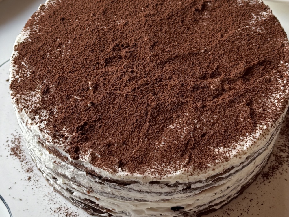 Коржи приготовились. Осталось промазать их кремом из сливок и сгущенки. Сверху посыпаем торт какао-порошком. Приятного аппетита!