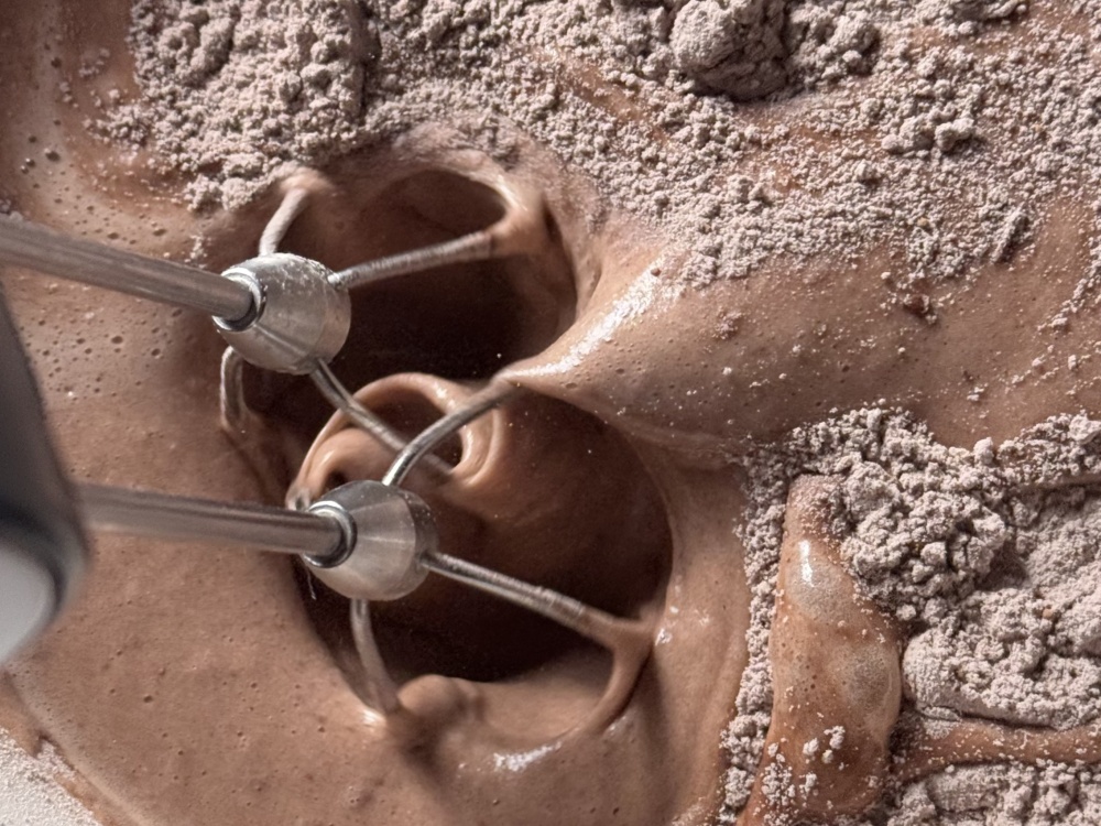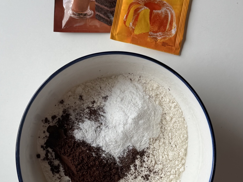 Разбиваем в миску 3 яйца и добавляем сахар. Взбиваем венчиком 2-3 минуты, заливаем молоко и растительное масло. Хорошо перемешиваем и добавляем муку, какао, разрыхлитель.