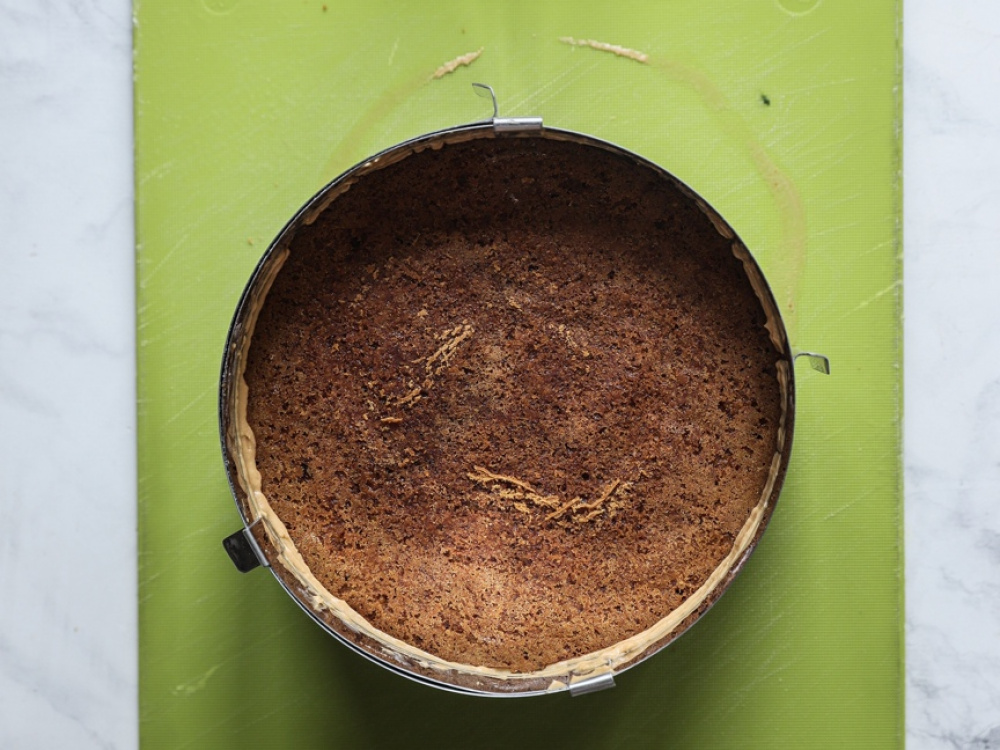 Собираем торт в кольце: на дно выкладываем корж, сверху смазываем 2 полными ст. л. крема. Так собираем весь торт.