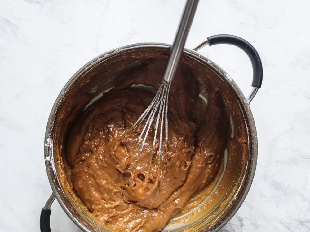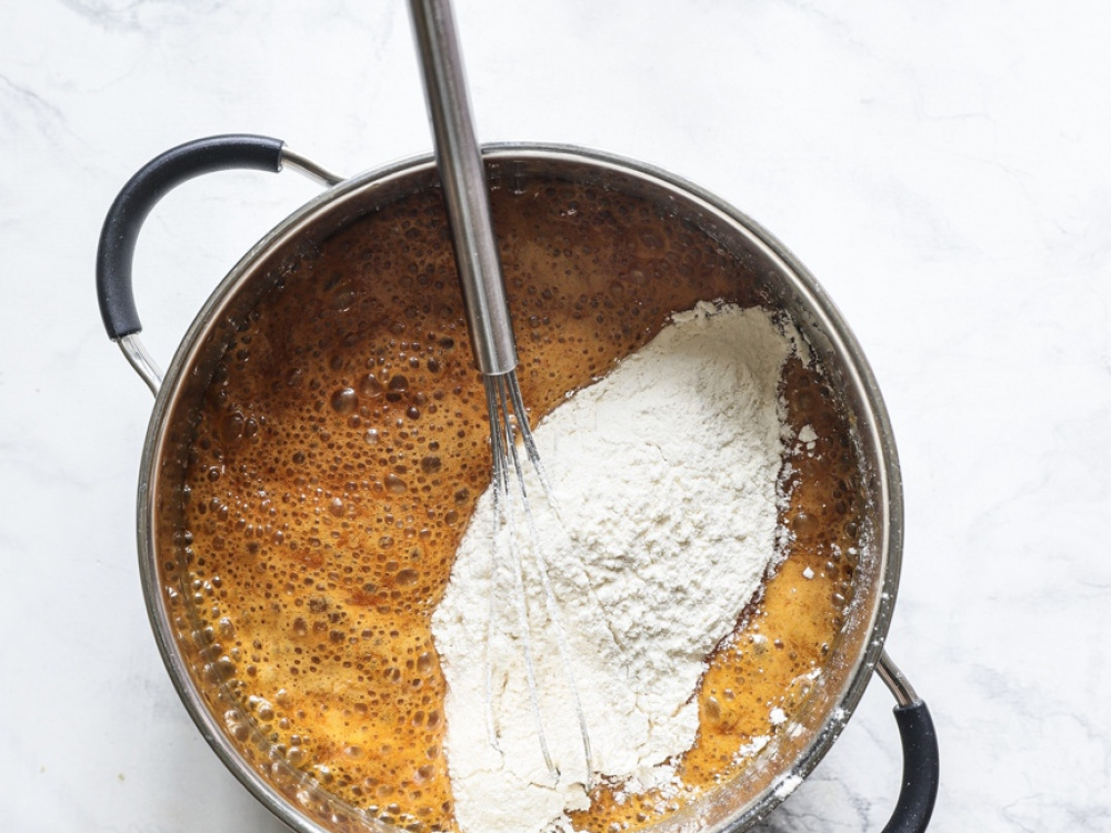 Снимаем получившуюся массу с огня и соединяем с мукой (200 г), хорошо вымешиваем.