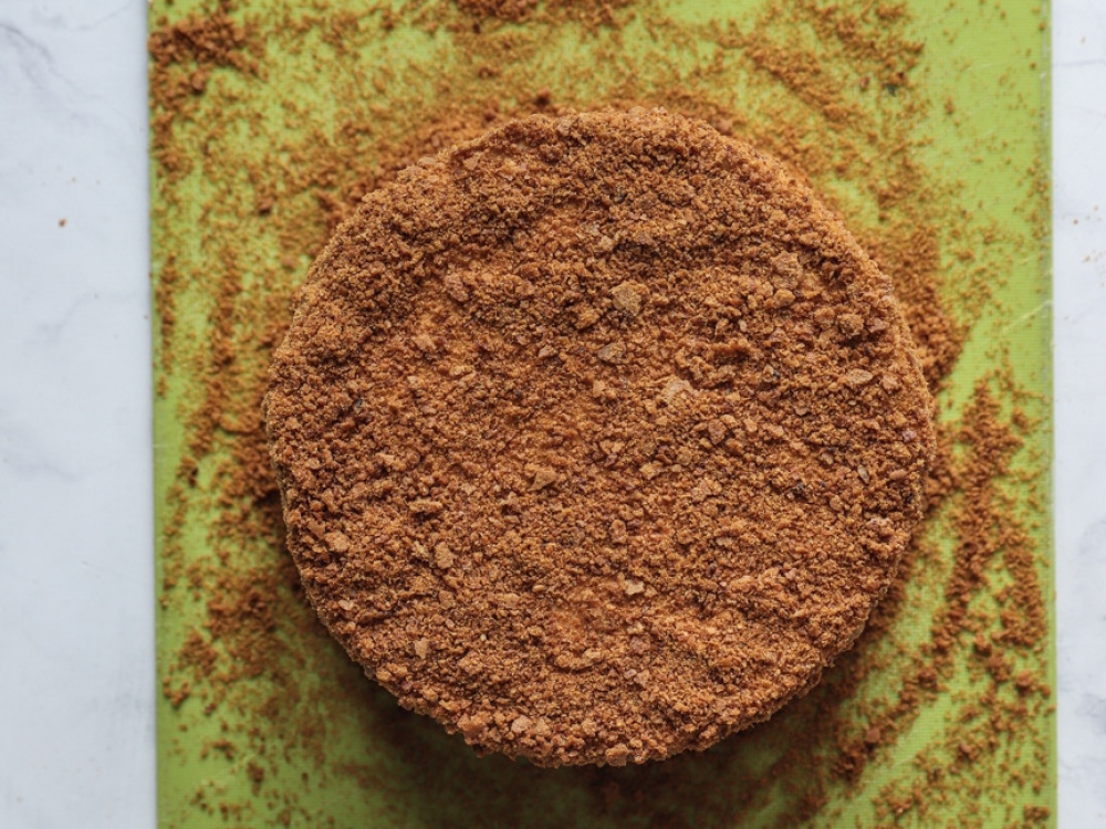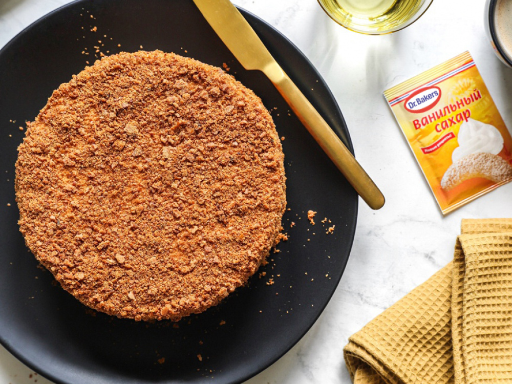 Выравниваем торт оставшимся кремом и посыпаем крошкой.