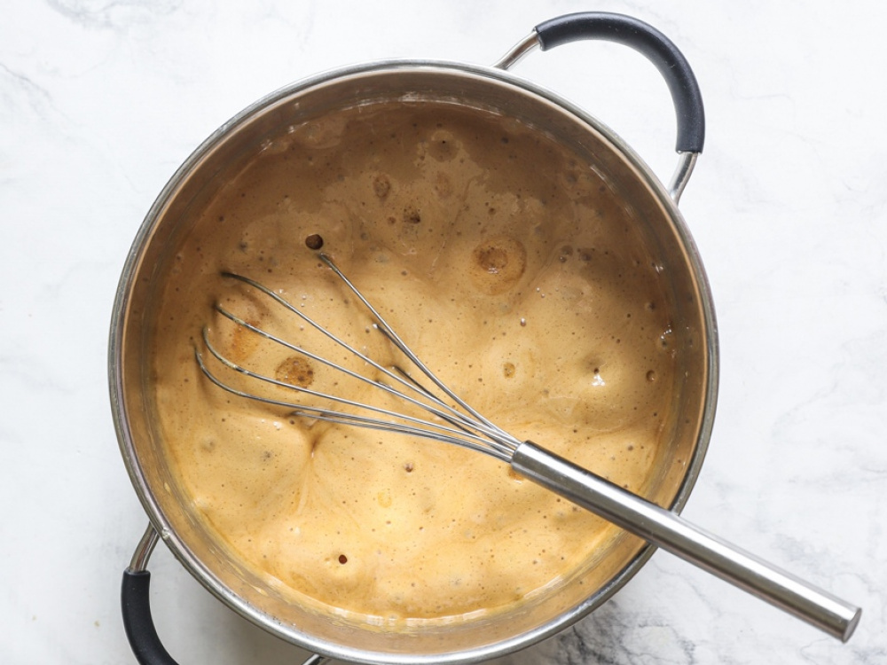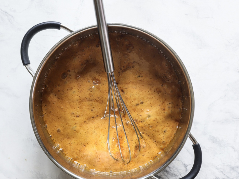Добавляем в сотейник соду (1/2 ч. л.) и интенсивно мешаем венчиком. Масса должна сильно увеличиться в объёме.
