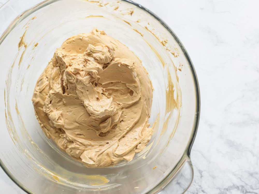 Для крема взбиваем сливочное масло (360 г) со сгущенкой (570 г) до однородной консистенции. Охлаждаем крем в холодильнике.