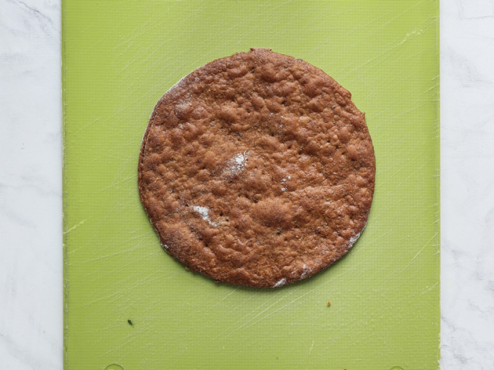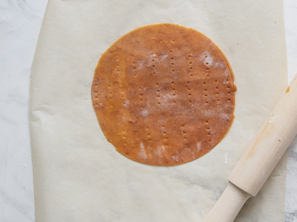 Вырезаем круги диаметром 20 см (это удобно делать кондитерским кольцом) и прокалываем вилкой. Из остатков теста раскатываем ещё два коржа.