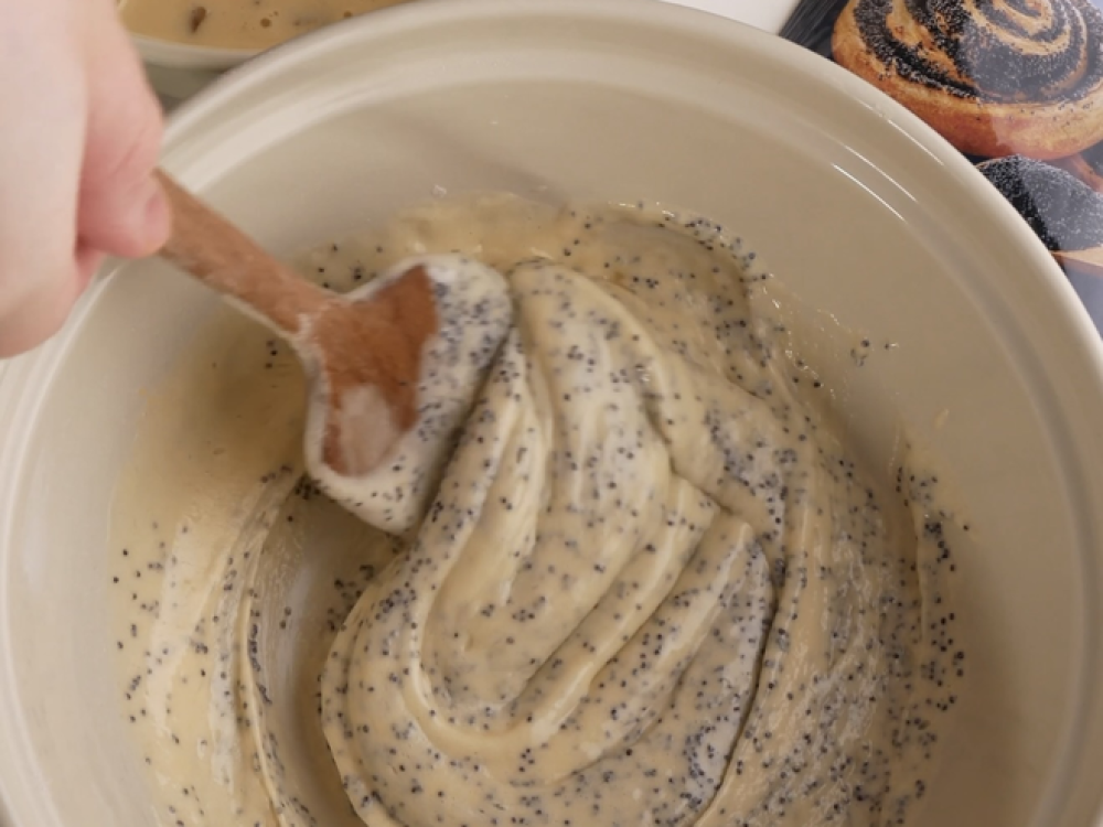 Делим получившееся тесто на две части. В одну часть добавляем изюм (20 г) и дроблёный грецкий орех (25 г), а в другую – мак Dr. Bakers (10 г). Форму для выпекания не смазываем. Выпекаем бисквиты при 170°C 35-40 минут.