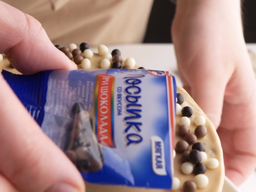 Покрываем торт сверху кремом и добавляем декор – мягкую посыпку «Три шоколада» и дроблёные грецкие орехи. Оставляем торт в холоде минимум на 5 часов.
