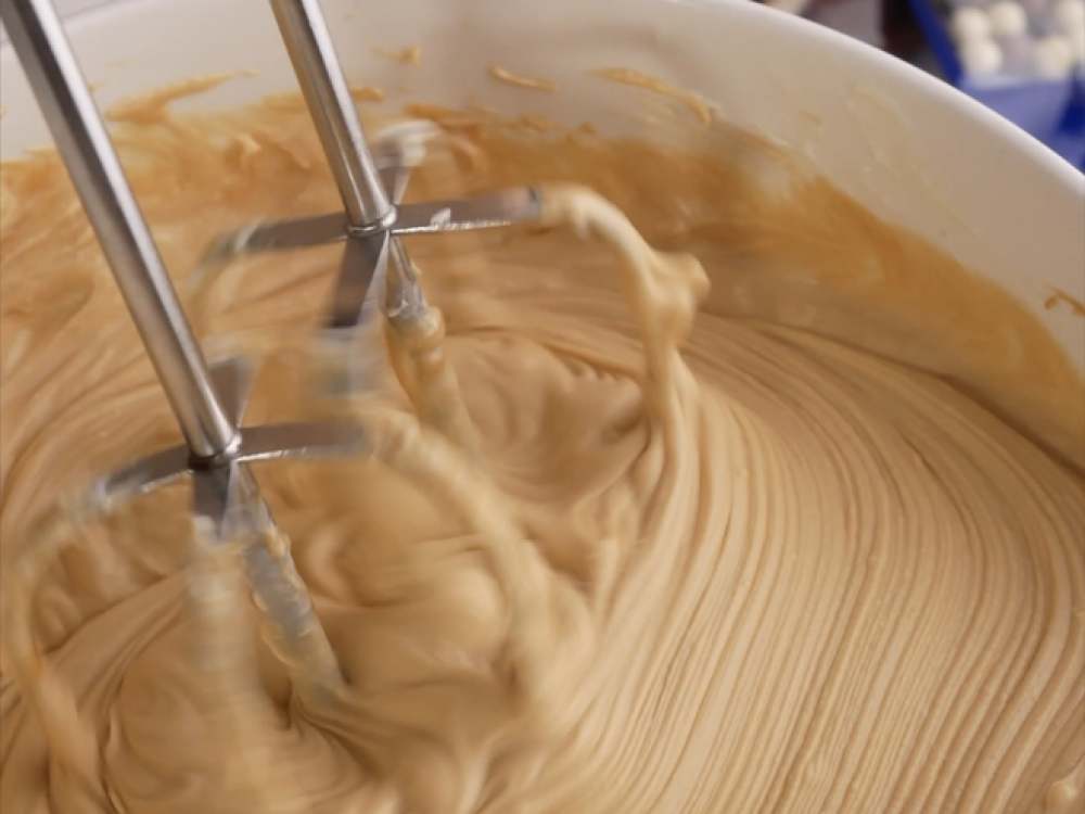 Готовим крем. Для крема взбиваем мягкое сливочное масло (180 г) с творожным сыром (300 г) и варёным сгущённым молоком до однородности. Убираем в холод на стабилизацию на 2 часа.