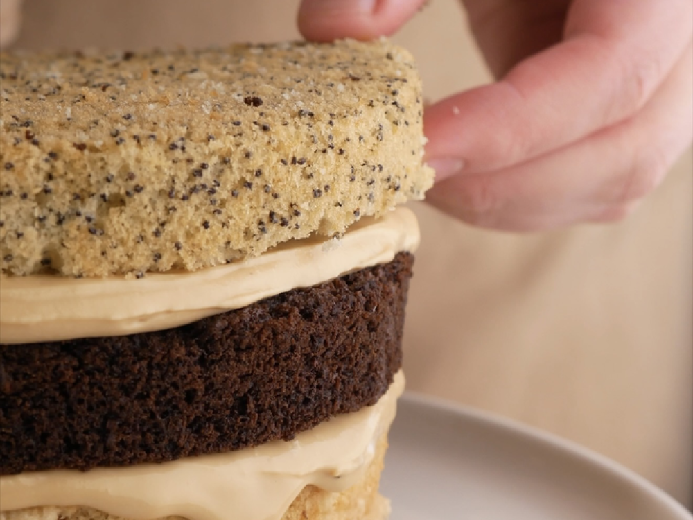Собираем торт, чередуя шоколадный и светлый бисквиты. Пропитываем каждый корж необходимым количеством молока (всего 200 мл) и смазываем кремом. Если торт нестабилен, используем кондитерское кольцо или шпажки для устойчивости. Удаляем шпажки перед едой из торта.