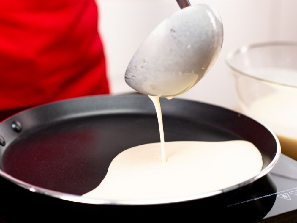 Выпекать тонкие блины на разогретой антипригарной сковороде с обеих сторон до золотистого цвета. Если блины прилипают к сковороде, периодически смазывать ее тонким слоем растительного масла и прокалять.