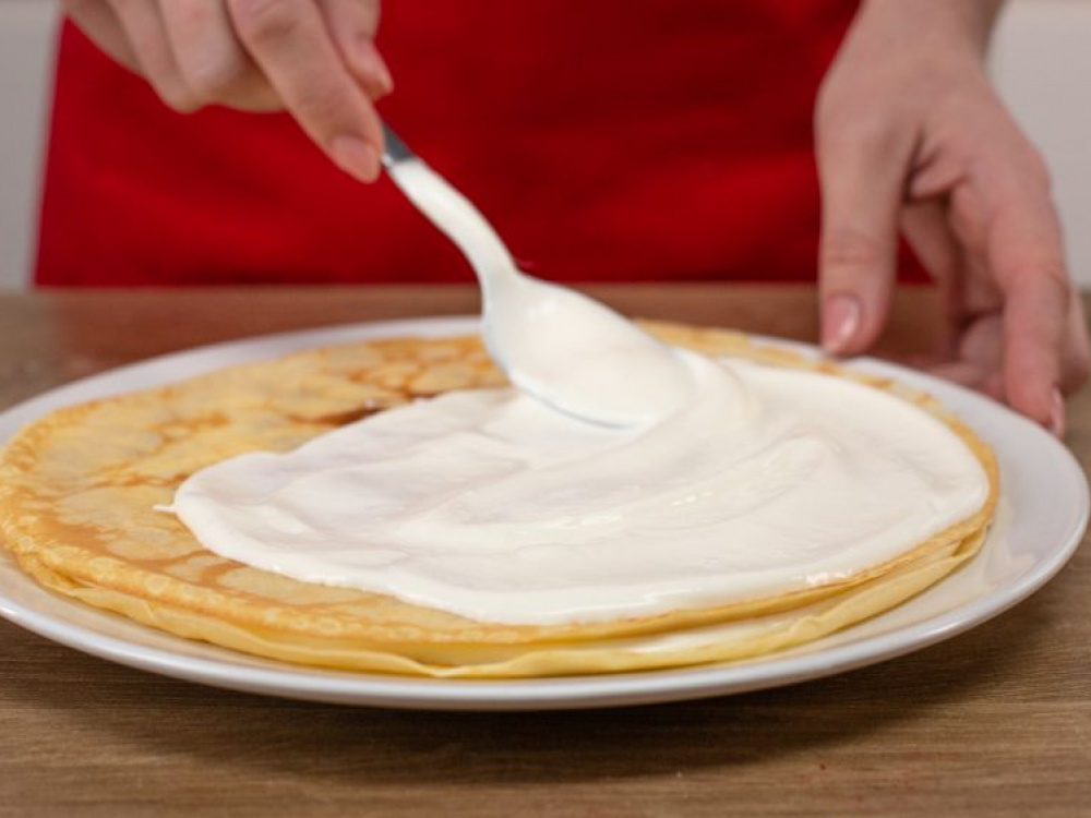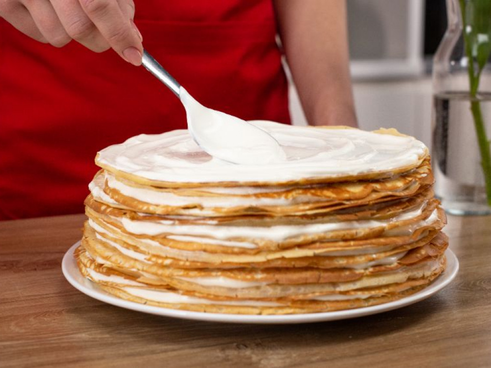 Совет: по желанию перед сборкой торта тонкие сухие края блинов можно обрезать, используя для этого тарелку подходящего диаметра — в таком случае высота готового торта будет одинаковой, и крем будет наноситься более равномерно. Для более высокого торта нужно увеличить количество ингредиентов в 1½-2 раза.